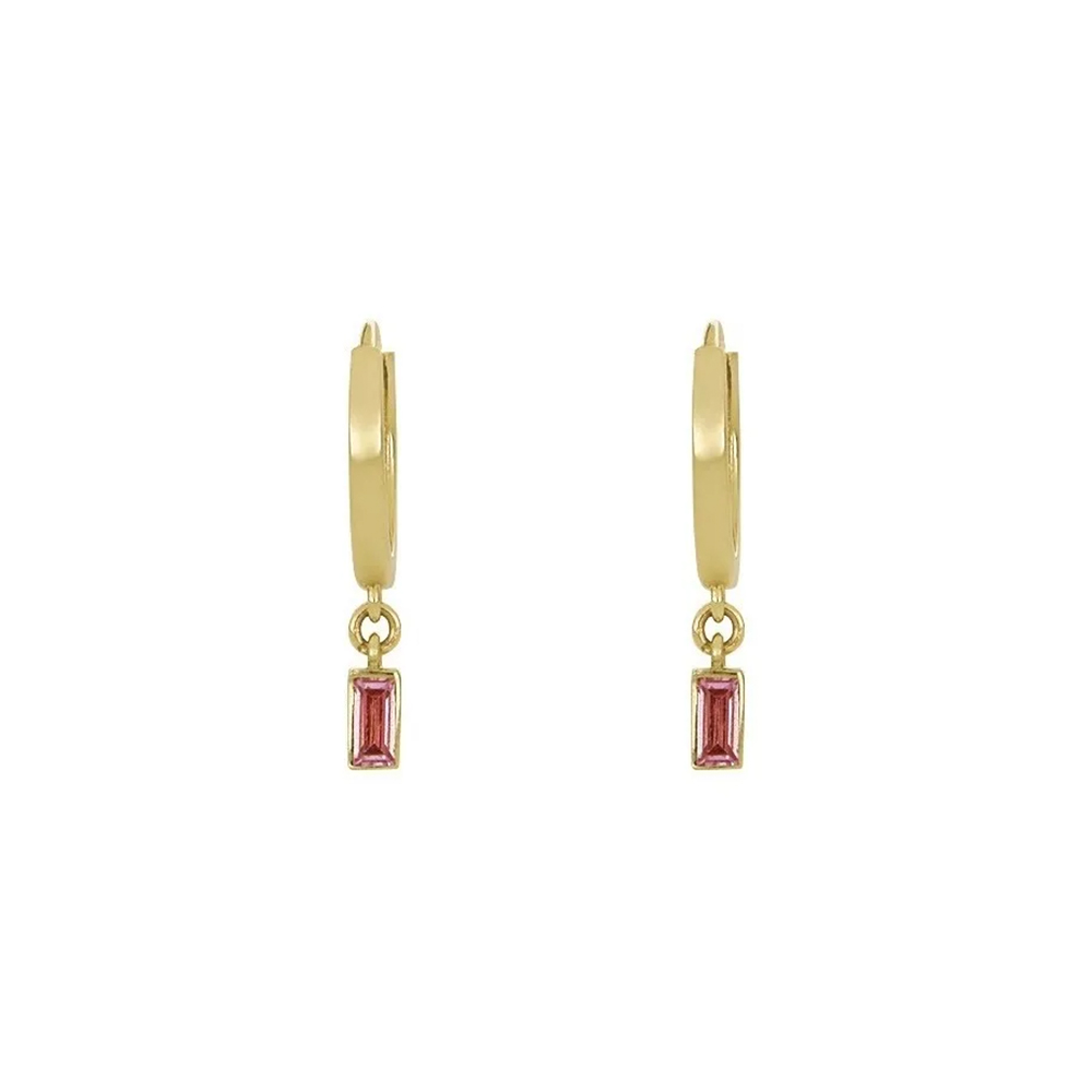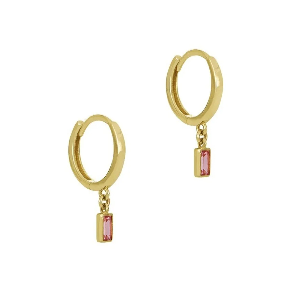 Aretes huggie dorados con piedras rectangulares colgantes en un vibrante tono rosa. Un diseño moderno que combina elegancia minimalista y un toque de color femenino.