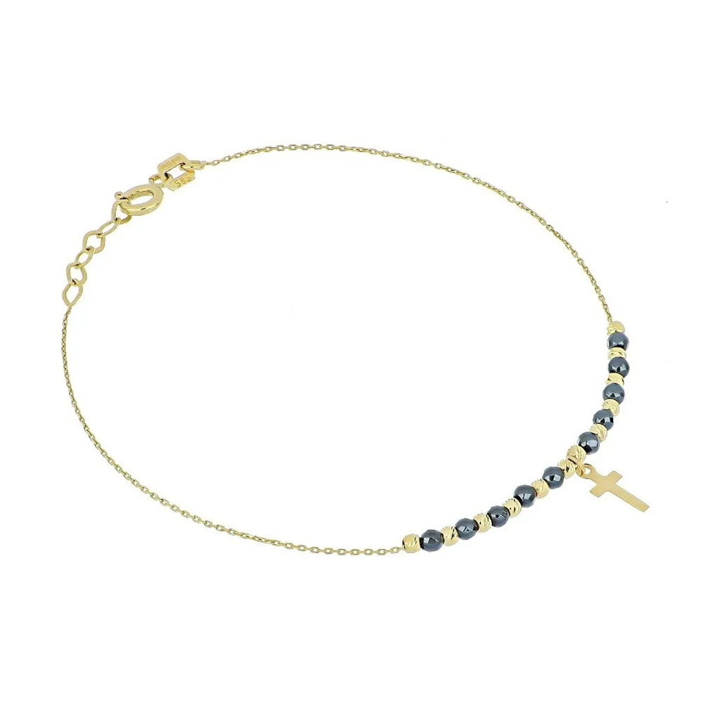 Lleva tu fe y tu estilo con esta pulsera que combina delicadeza y simbolismo. Presenta una fina cadena de oro con una sección de cuentas de hematita negra facetadas que capturan la luz. El toque final es una sutil cruz de oro que cuelga elegantemente, creando una pieza de gran significado.