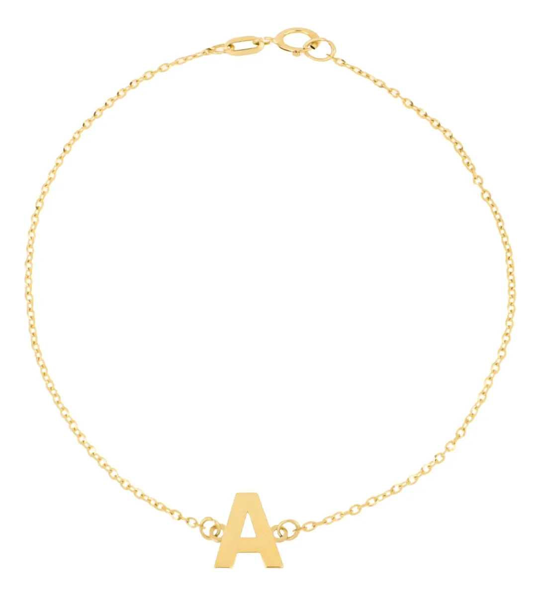 Pulsera Zekie de oro 14K con una delicada letra “A”. Su cadena fina y el dije plano crean un estilo minimalista y elegante. Perfecta para personalizar tu look con un toque sutil y significativo. Ideal para llevar sola o combinar.